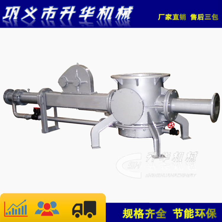 氣力輸送設備料封泵由進氣部分、擴散混合室、出料部分組成。進氣部分由進氣調節、活動風管、調整機構、噴嘴等組成。擴散混合室由泵體、氣化裝置、上部落灰斗組成,出料部分由擴壓器(減縮管、減擴管)出灰短節組成。